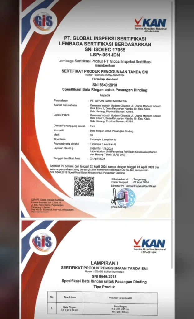Produk memenuhi standar SNI dan pengujian pabrikan. Lampirkan sertifikat, nomor standar, serta ringkasan parameter uji kunci untuk transparansi kualitas maksimal.